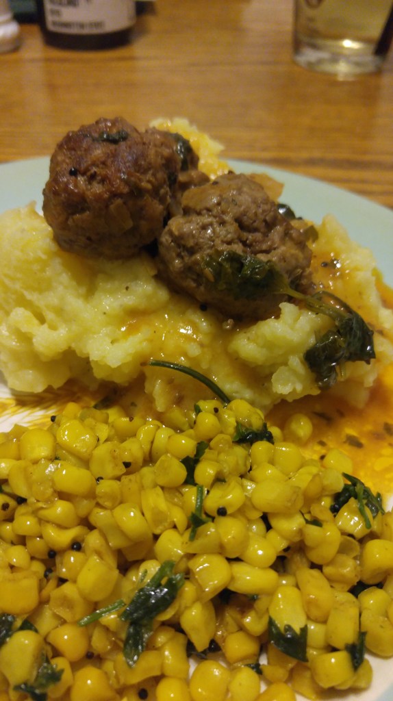 Lamb Meatballs in a curry with Mustard Seed Corn
